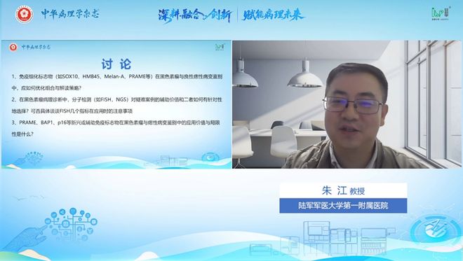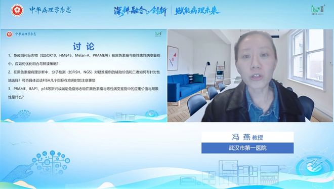 在讨论环节中,冯燕教授表示,尽管免疫组化试剂的敏感性较强,但仍需注意其表达谱系,特别是HMB45的应用,虽然在恶性黑色素瘤中表现为强阳性,但在其他类型的肿瘤,如透明细胞肉瘤中,也可能出现阳性,提示我们不能局限于单一的免疫标志物。冯教授还提到,免疫标志物的表达模式比阳性与否更为重要,因此结合临床病史和形态学特征进行综合判断尤为关键。她补充道,分子检测,特别是NGS和FISH,为恶性肿瘤的诊断提供了巨大的帮助,尤其在形态学诊断困难时。朱江教授指出,免疫组化在鉴别黑色素瘤和良性痣时的确具有重要作用,尤其是S100、HMB45和Melan-A等标志物,但在一些特殊病变中也可能出现阳性结果,因此需要特别关注表达强度和分层现象。同时,朱教授提到,FISH检测的阈值问题在临床中常常带来困惑,尤其是在低强度阳性时,如何界定其诊断意义仍需进一步探讨。冯燕教授还提到,P16和PRAME的应用也有助于黑色素瘤的诊断,但这些标志物的表达需要结合形态学和临床信息进行全面判断。