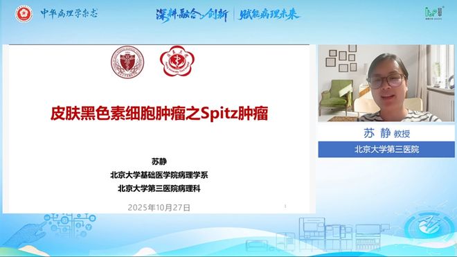 北京大学第三医院苏静教授在会上作了《皮肤黑色素细胞肿瘤之Spitz肿瘤》报告,苏教授围绕Spitz肿瘤的临床与病理特点进行了详细阐述。她从一个16岁男孩的病例入手,讲解了如何通过组织学观察判断黑素细胞肿瘤的良恶性。苏教授强调,Spitz肿瘤在形态上与恶性黑色素瘤非常相似,但其生物学行为通常是良性的。她提到,随着临床经验的积累,越来越多的特征帮助我们识别Spitz肿瘤,如细胞的多形性、核分裂现象和“资本小体”的出现等。此外,苏教授还介绍了Spitz肿瘤的历史和演变,指出其在儿童中较为常见,且随着年龄的增长,诊断难度也逐渐增加。她详细解释了如何通过分子检测技术,特别是ALK和NTRK基因断裂的检测,帮助明确诊断,进一步区分Spitz肿瘤与其他类型的黑色素瘤。她还提到,虽然Spitz肿瘤的形态特征和分子标志物尚无完全统一的标准,但分子生物学技术的进步,特别是ALK基因的融合和NTRK基因的断裂,为病理学家提供了更为精确的诊断工具。通过结合免疫组化和基因检测,医生可以更好地评估Spitz肿瘤的生物学行为,进一步判断其良恶性。